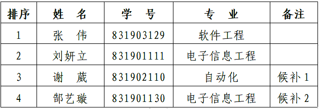 根据《关于做好2019—2020学年本科生国家奖学金、本科生国家励志奖学金、2020年研究生国家奖学金评审工作的通知》(福大学〔2020〕35号)文件精神,学院成立评审小组,经本人申请、学院初评、公开答辩、评审小组讨论并投票,拟同意推荐张伟等4位同学申请2019-2020学年本科生国家奖学金(含候补人选,根据得票数排序)。