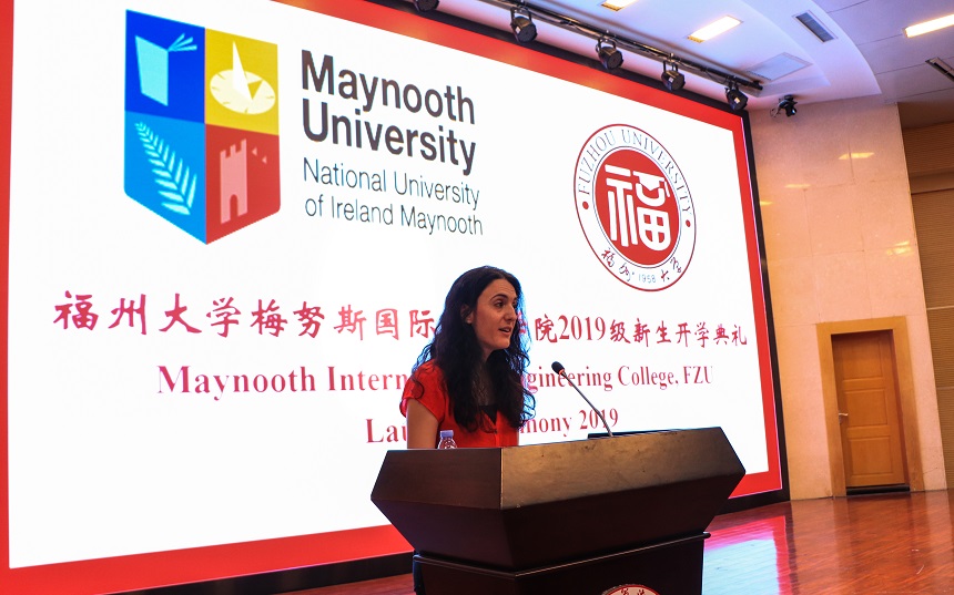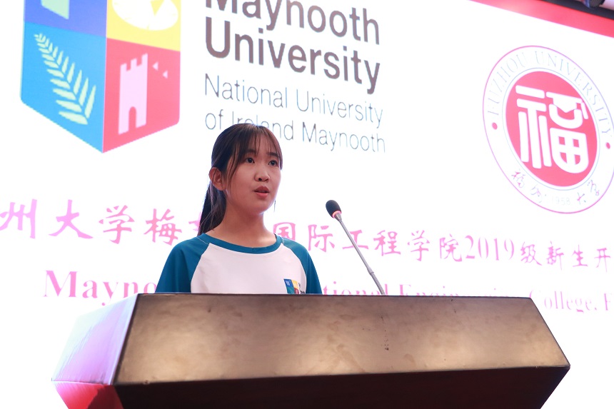 Aidan·Mulkeen(艾登·穆尔肯)副校长应邀发表了热情洋溢的致辞,他表示,爱尔兰国立梅努斯大学将依托本国教育体制与福州大学深化合作,致力于为学生提供多元化的教育体验;期盼大家通过四年大学生活,锻炼理解能力、学会乐于助人、发展良好的专业技能。随后,外方教师代表Kyriaki·Niotaki(卡里亚基·尼欧塔基)女士和新生代表张伟同学相继发言,分别鼓励新生们努力学习、健康成才,为社会贡献自己的青春力量;希望新生们将“明德至诚 博学远志”的校训精神内化于心,少些浮躁多些踏实、少些安逸多些拼搏、少些自我多些家国情怀,成就更优秀的自己。