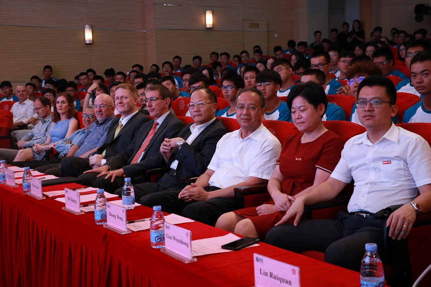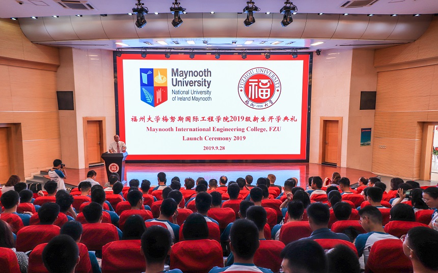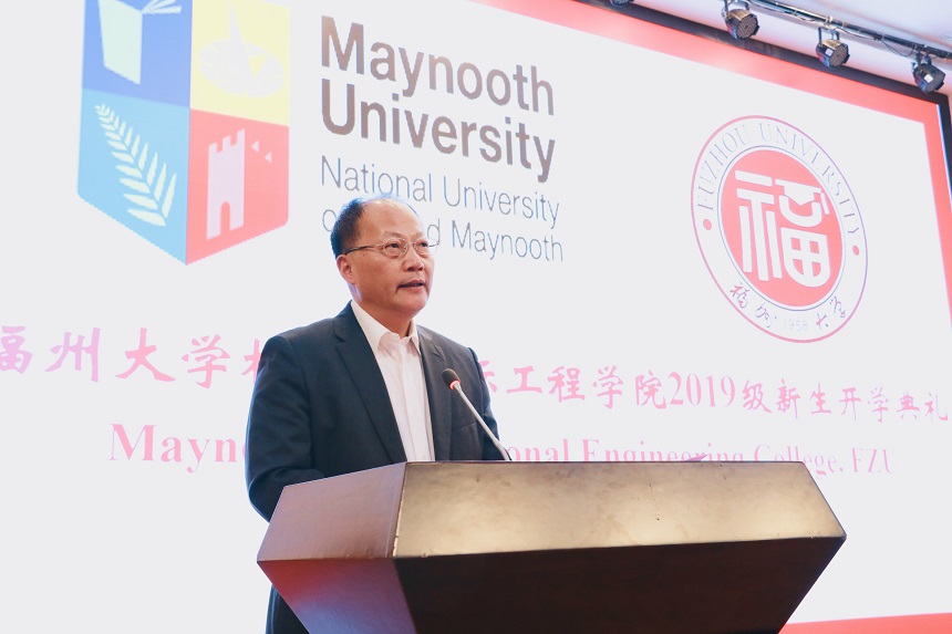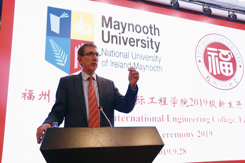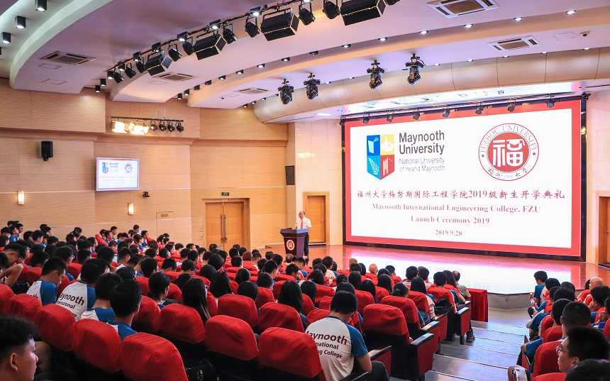 ,群贤荟萃、胜友如云。恰逢新中国迎来70周年华诞喜庆之时,学院2019级暨首次新生开学典礼于旗山校区模拟法庭礼堂隆重举行。爱尔兰国立梅努斯大学Aidan·Mulkeen(艾登·穆尔肯)副校长、科学与工程学院Ronan·Farrell(罗南·法雷尔)院长不远万里专程莅临;福州大学副校长兼学院院长王健,学院外方副院长Ronan·Reilly(罗南·雷利),电气工程与自动化学院何希耕书记、物理与信息工程学院张红书记、数学与计算机科学学院郭文忠院长应邀出席;全体嘉宾与2019级新生及中外方行政人员、中方专业负责人、外方教师齐聚一堂,共同见证学院历史时刻。