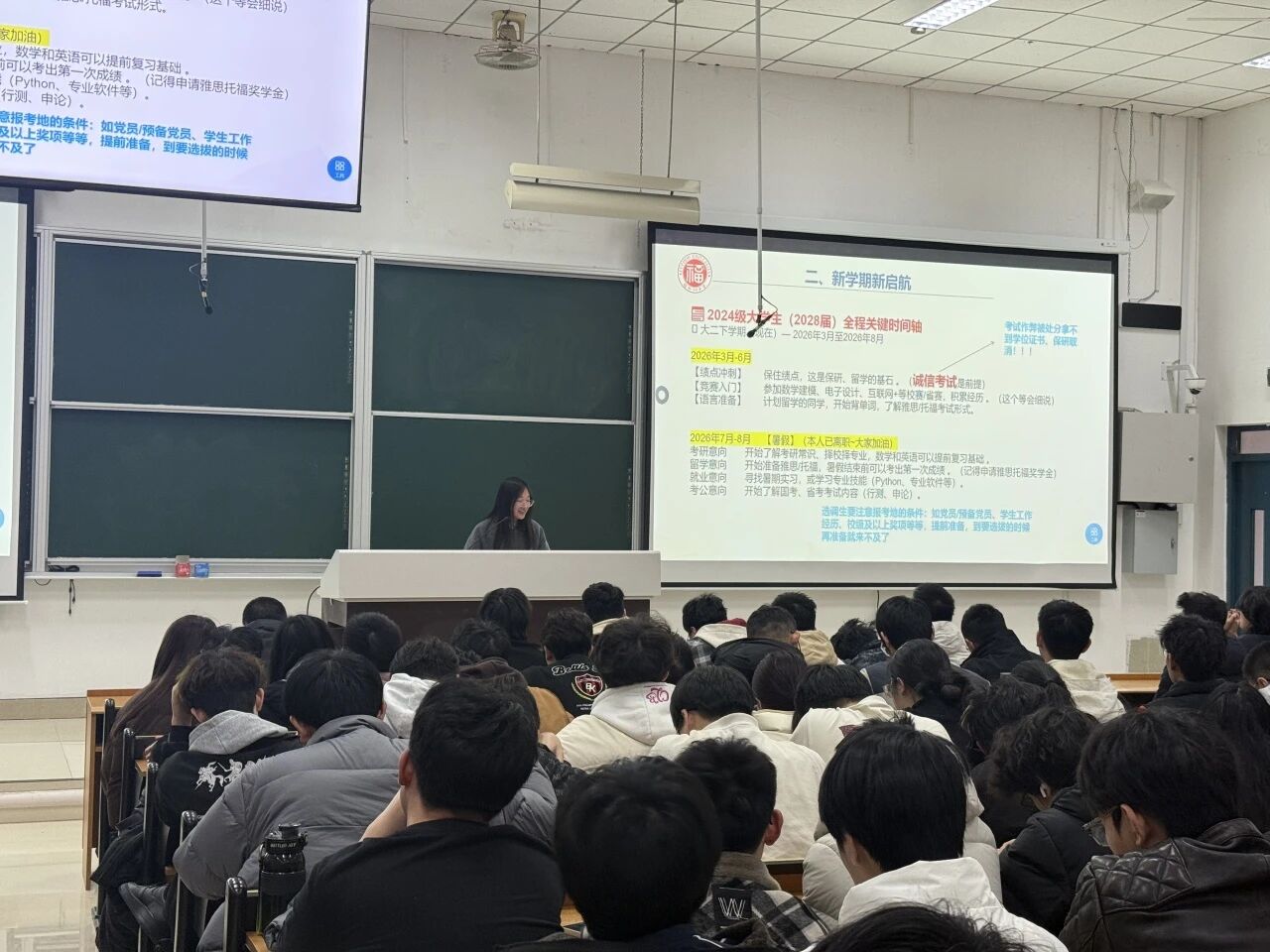 此外,24级辅导员陈曦老师也对同学们过去一学年的学习生活经历与成长收获进行了简要总结,并为大家梳理了从大二下至大四的关键时间节点与升学、就业路径规划,清晰呈现了保研、考研、留学、考公等不同方向的时间线,鼓励大家带着过往积累,在新学期锚定目标、稳步前行。