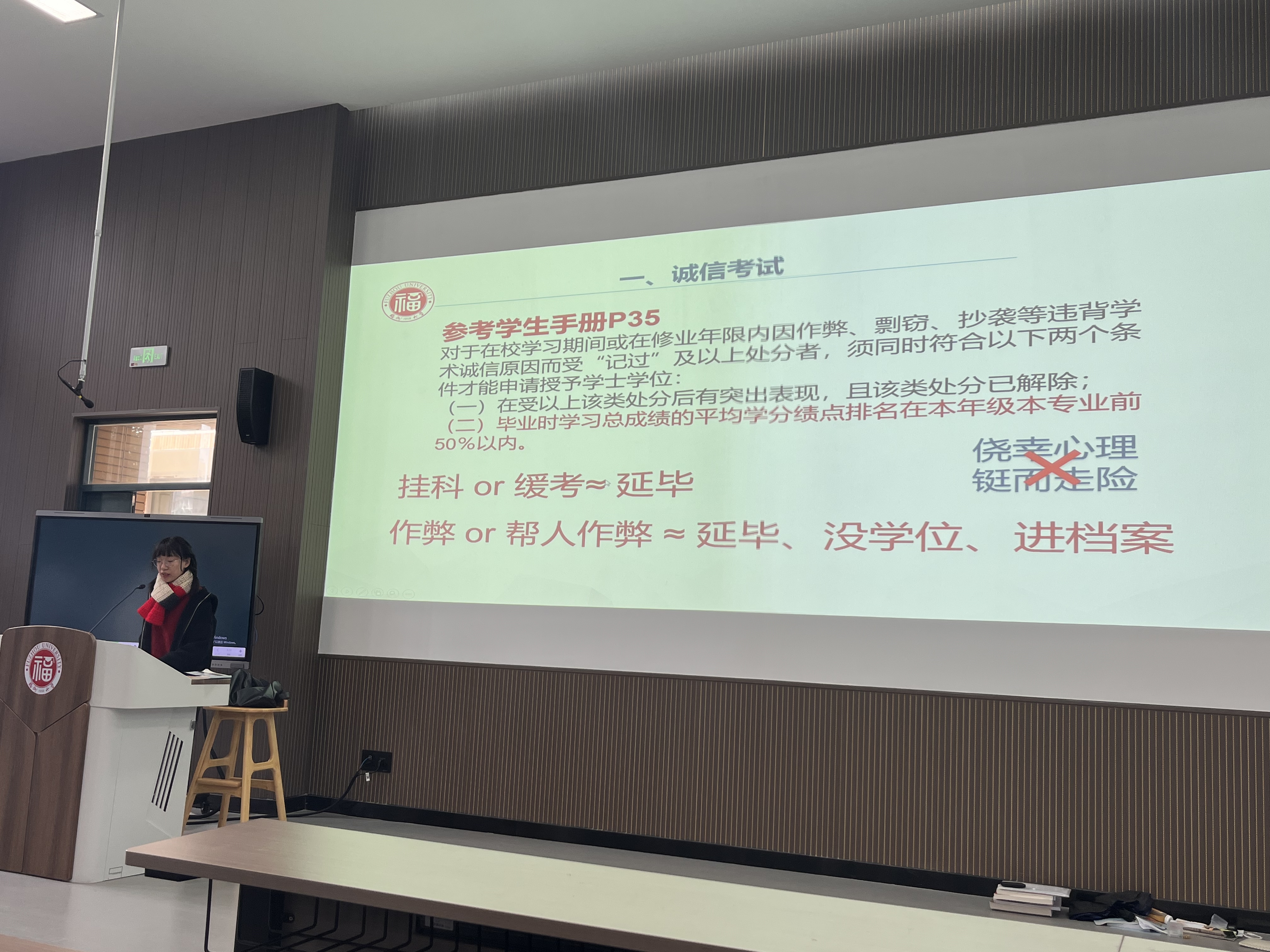在会议过程中,各年级辅导员向同学们强调了常规考试纪律以及考试违规处理办法和违纪处分规定,告诫同学们务必重视学术诚信,并希望各班学习委员根据各班具体情况为同学们做好诚信考试的思想工作,呼吁全体同学以严谨的态度对待每场考试。随后同学们签订了诚信考试承诺书,承诺杜绝一切考试作弊行为,公平竞争,遵守考场纪律,坚决不报侥幸心理。